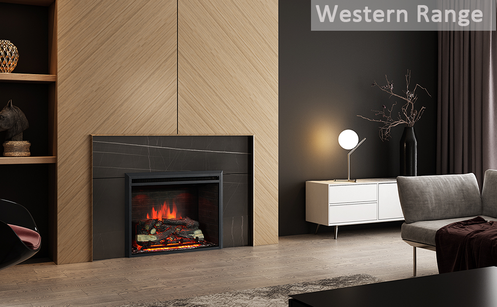 PuraFlame Western Electric Fireplace Insert with Fire Crackling Sound, Remote Control, 750/1500W, Black, 22 53/64 Inches Wide, 20 3/64 Inches High