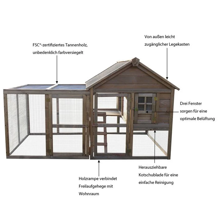 Der Dehner Lieblinge Hühnerstall Mondalay ist ein hochwertiges, wetterfestes Modell für die Hobby-Hühnerhaltung, das keinen Wunsch offenlässt. Die stabile Konstruktion besteht aus massivem FSC®-zertifiziertem Tannenholz, das mit einer unbedenklichen Farbe, die die DIN-Klassifizierung EN-71-3 (Europäische Norm für Spielzeugsicherheit) trägt, gestrichen wurde. Aber auch für das komfortable Handling ist gesorgt. So können Sie die Kotschublade aus Metall von außen herausziehen und säubern. Auch der Legekasten ist bequem von außen zugänglich. Der Dehner Lieblinge Hühnerstall Mondalay hat außerdem insgesamt 3 Fenster für eine optimale Belüftung und 4 Außentüren sowie eine Tür, die vom Innenbereich in den Freilauf führt, die alle mit stabilen Bolzen gesichert sind. Die Wandstärke des Holzes beträgt 1,6 cm.