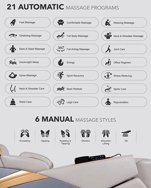 The 21 auto programs combine the 6 different massage techniques available in the chair. These 6 massage styles are Kneading. Tapping. Kneading & Tapping. Shiatsu. Shoulder Lifting and 3D.- Fast Massage: Experience all the massage effects quickly.